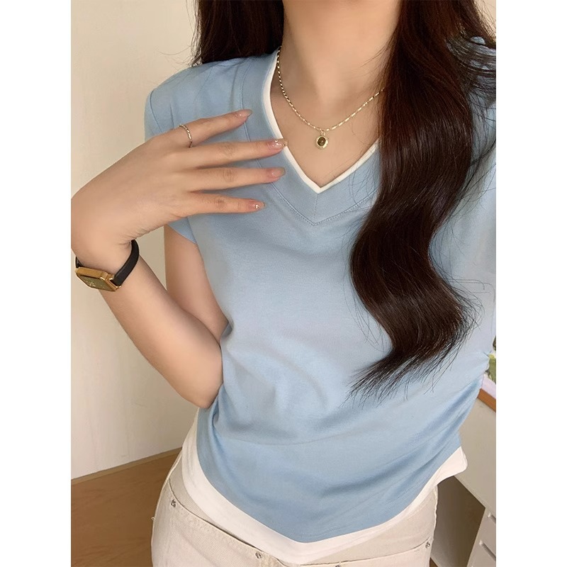 弧形下摆V领正肩t恤女短袖春夏新款设计感抽褶收腰显瘦假两件上衣