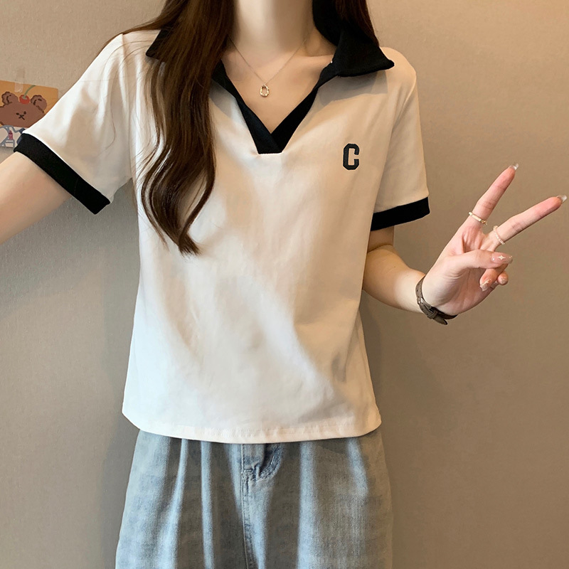 撞色polo领t恤女短袖夏季洋气锁骨别致v领短款上衣体恤