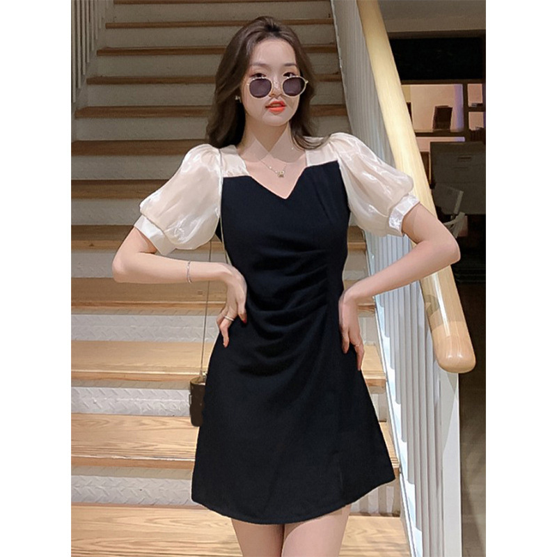 新款茶歇法式赫本风小黑裙温柔风小个子减龄气质泡泡袖连衣裙