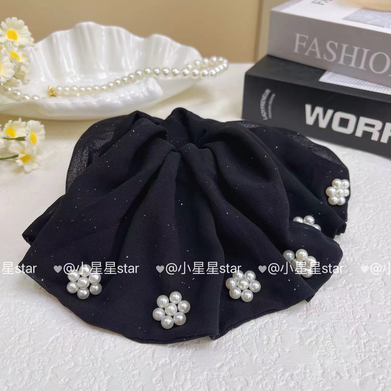满天星河黑色头饰法式钉珠赫本风高级感气质大肠发圈珍珠花朵头绳