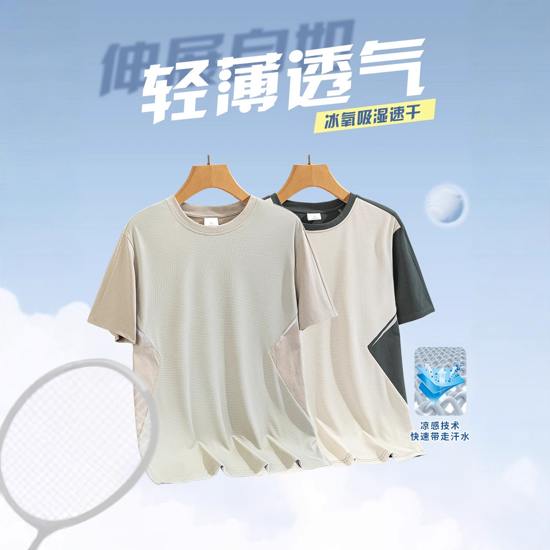 短袖T恤男士2025夏季新款吸湿速干透气双面拼色休闲运动圆领上衣