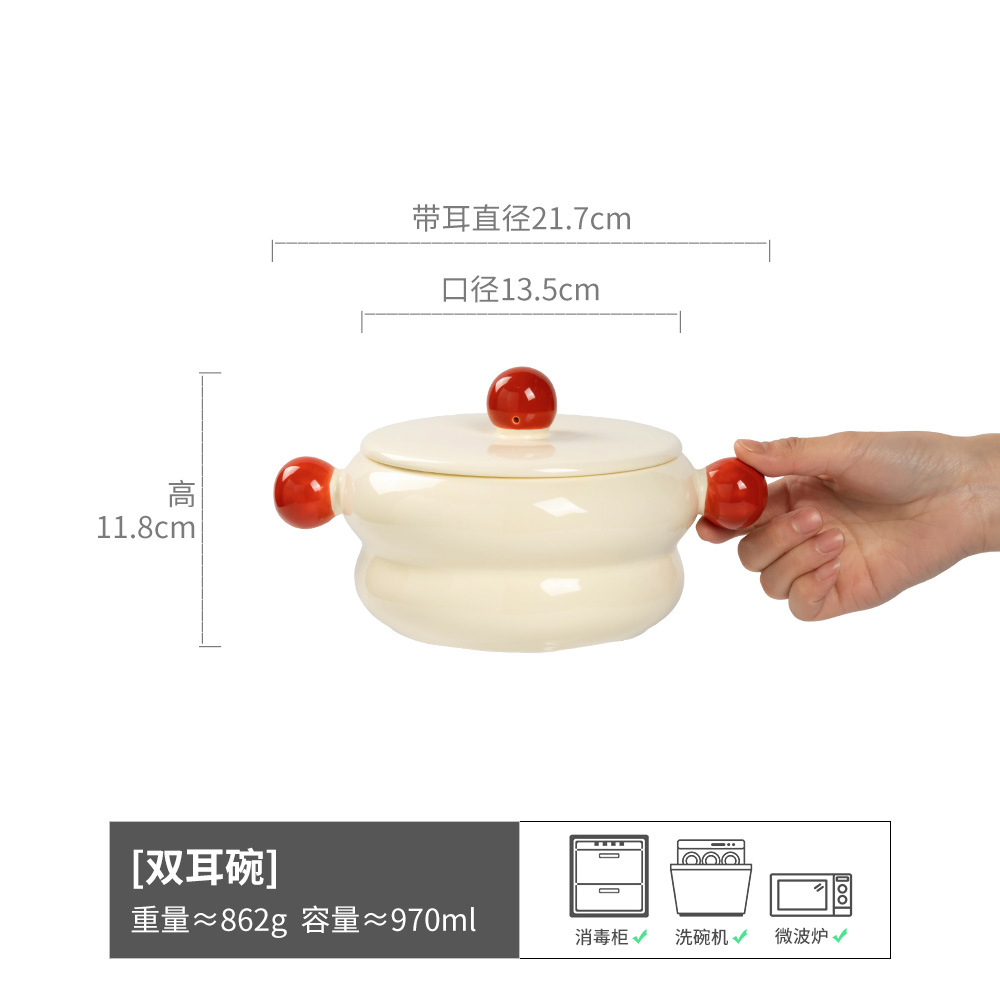 精致双耳碗可爱球球手柄陶瓷碗家用碗高颜值收纳餐具碗泡面碗