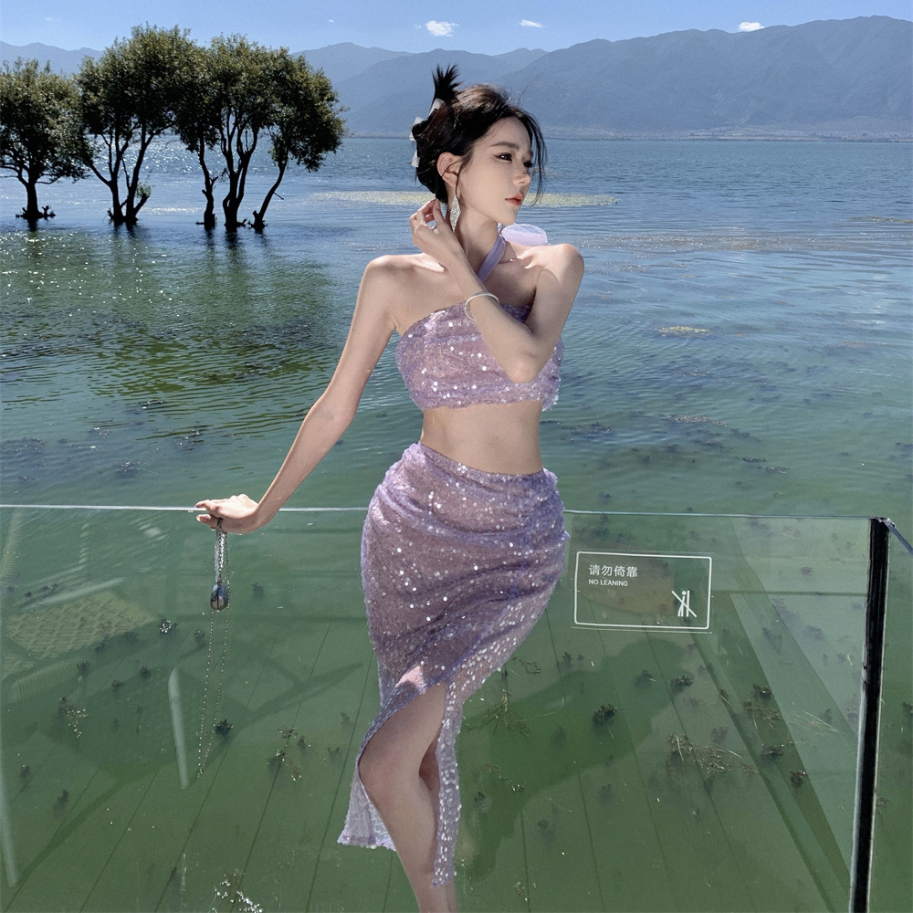 夏季紫色亮片抹胸开叉半身裙显瘦私房度假鱼骨套装旅游摄影两件套