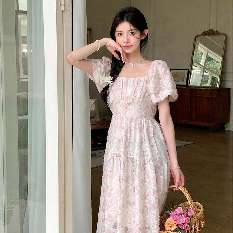 法式方领泡泡袖松紧显瘦印花连衣裙夏季高级感气质休闲超仙碎花裙