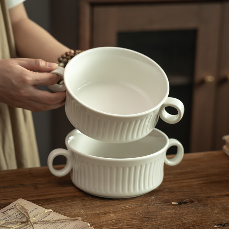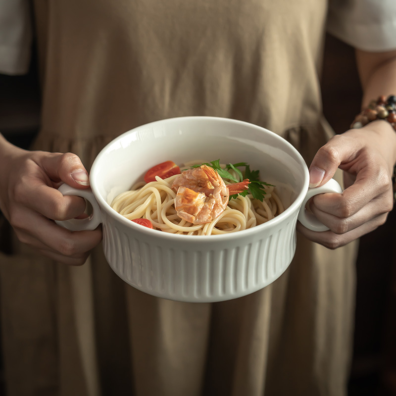 简约又实用韩式竖纹陶瓷双耳碗纯色泡面碗水果碗沙拉碗家用餐具碗