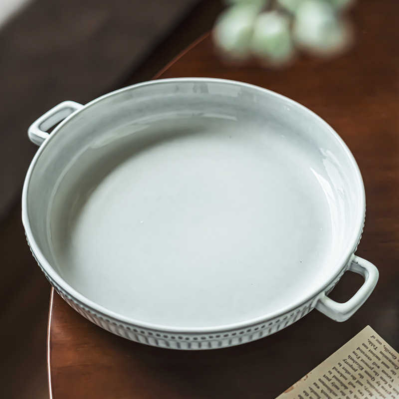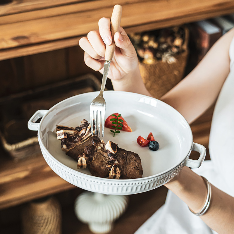 北欧复古风创意双耳盘陶瓷竖纹珠点浮雕盘子家用水果沙拉盘甜品盘