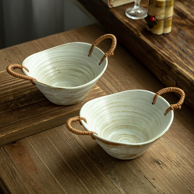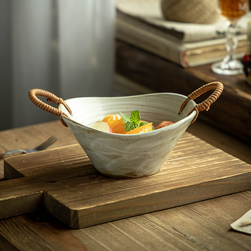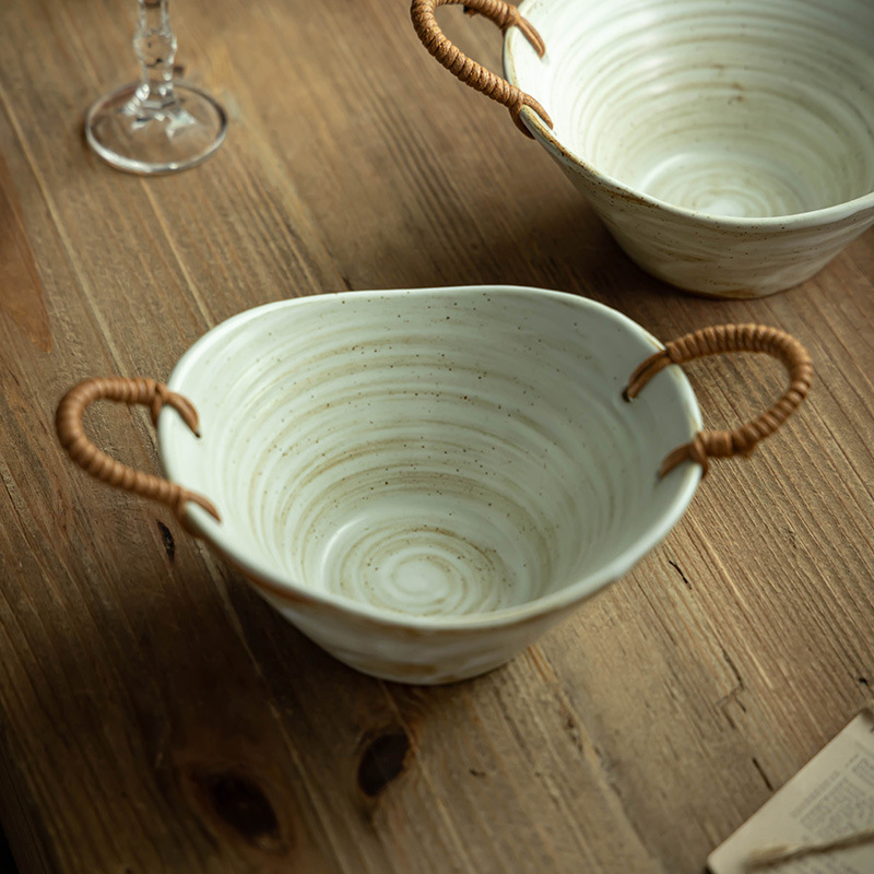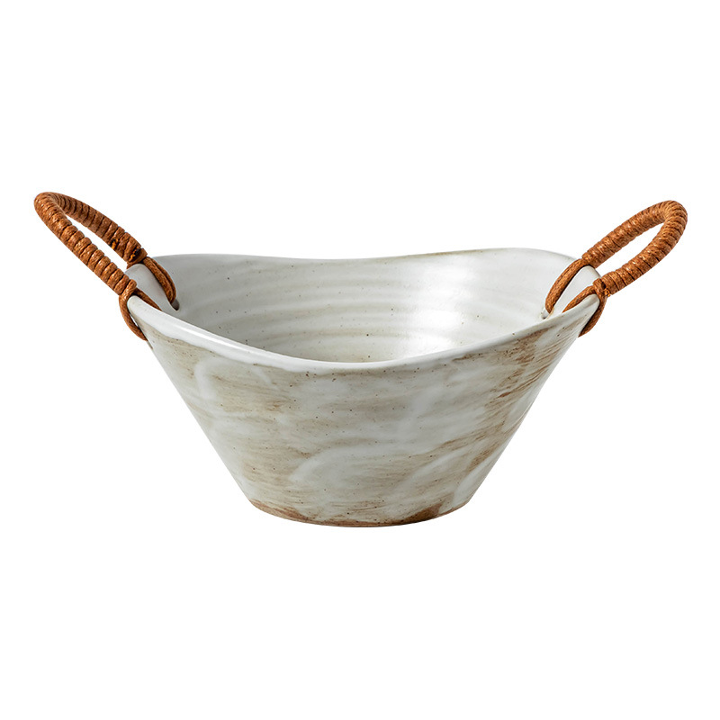 日式复古麻绳双耳碗粗陶提绳异形碗笠形沙拉碗民宿风餐具家用菜碗