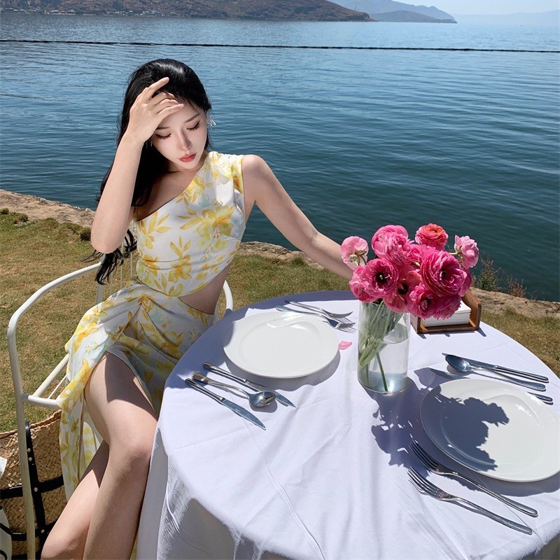 泰国海边旅游度假沙滩裙女夏碎花露腰斜肩连衣裙开叉修身包臀长裙