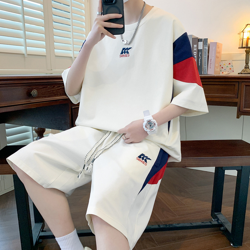 休闲运动套装男士夏季新款一整套短袖t恤短裤宽松圆领拼接两件套