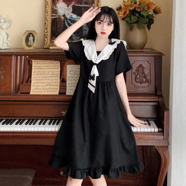 大码法式日系少女学院风连衣裙女胖mm夏季减龄显瘦蝴蝶结黑色裙子