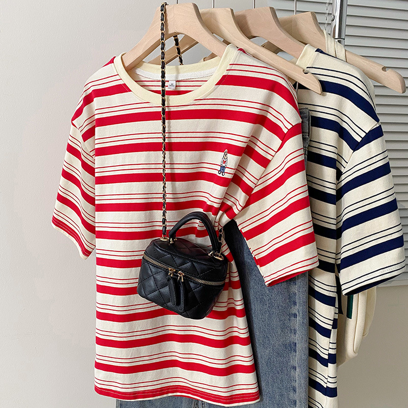纯棉撞色条纹短袖T恤女夏季韩版学生宽松显瘦休闲减龄半袖上衣服
