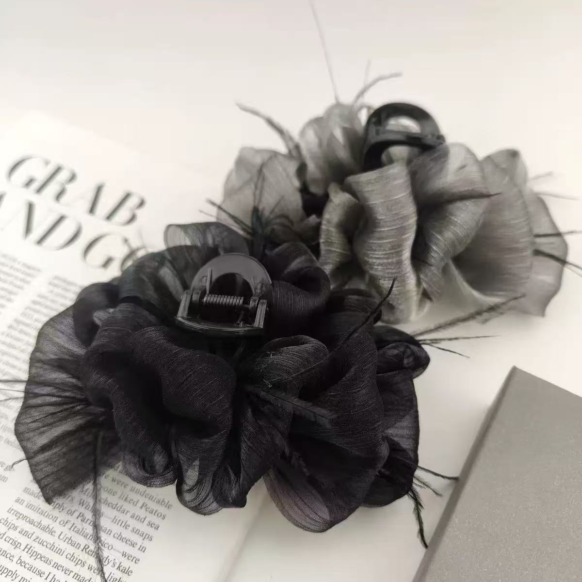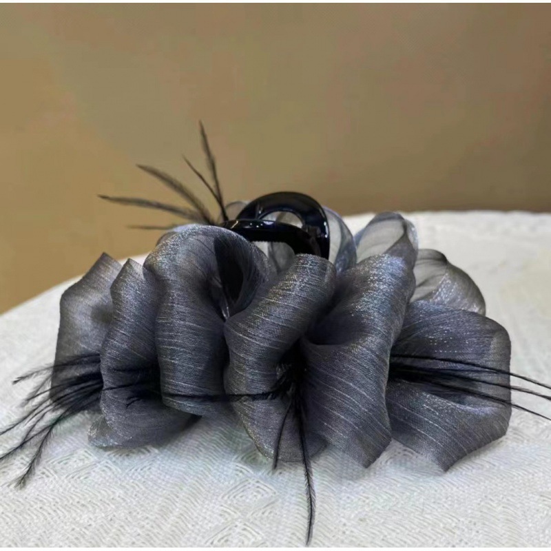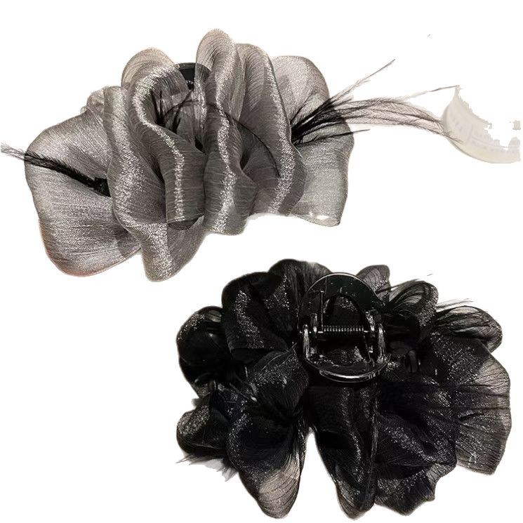新款黑色羽毛抓夹女高级感发夹后脑勺鸵鸟毛毛绒鲨鱼夹子头饰