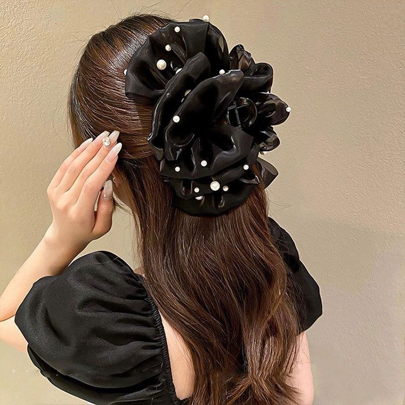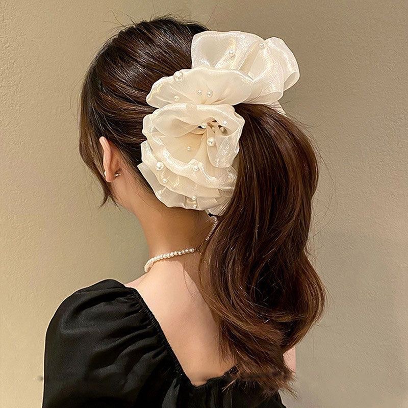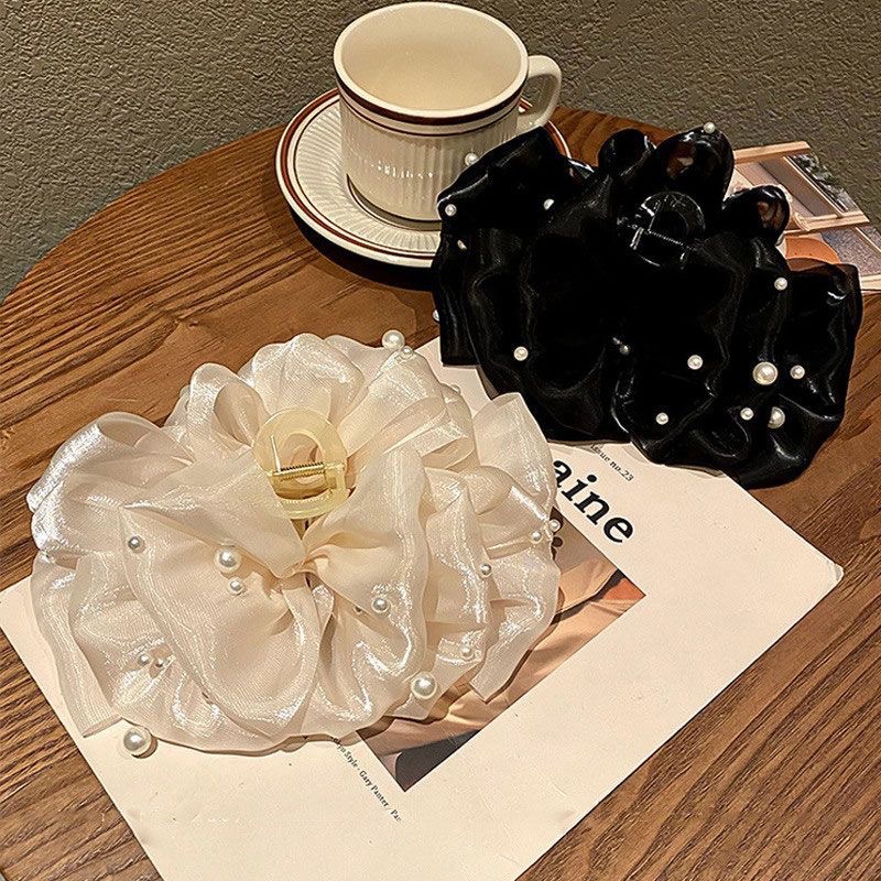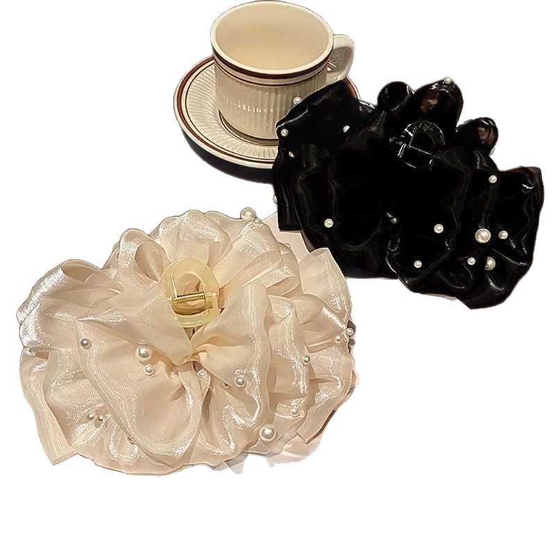 2025新款泡泡网纱珍珠款抓夹女气质多层蝴蝶结超大号后脑勺鲨鱼夹