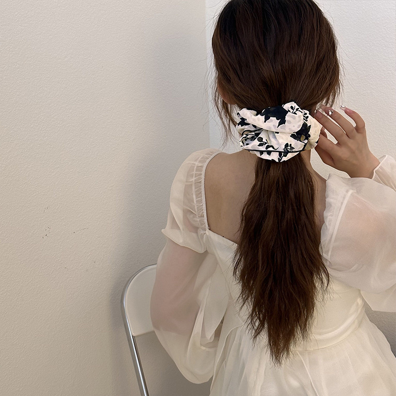新复古印花蝴蝶结水墨裙摆发圈头绳女高级感温柔优雅发绳飘带