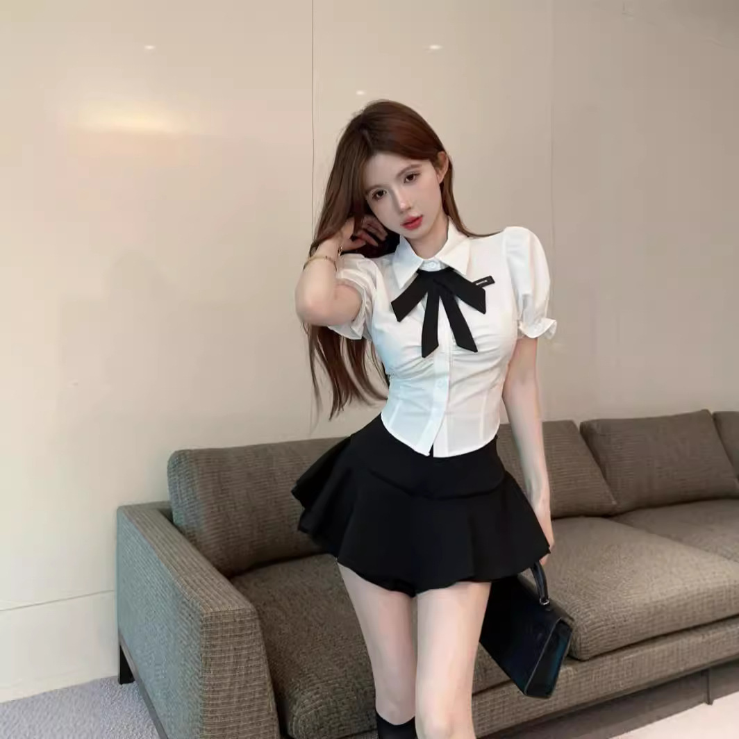 夏季学院风jk制服套装女小个子甜辣妹泡泡袖上衣高腰半身裙两件套
