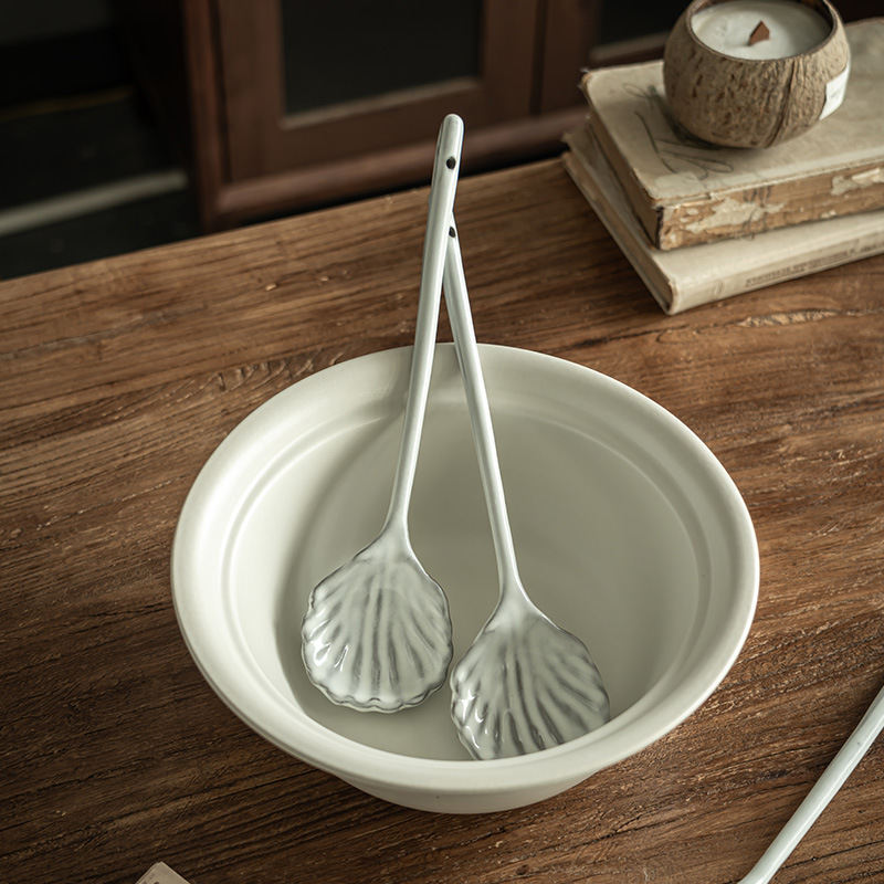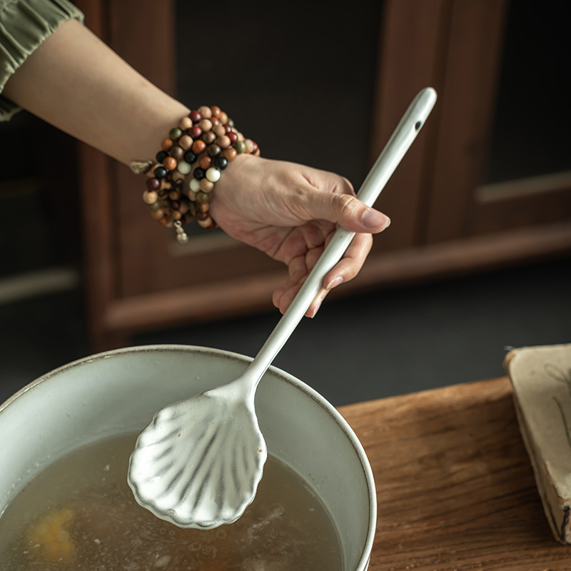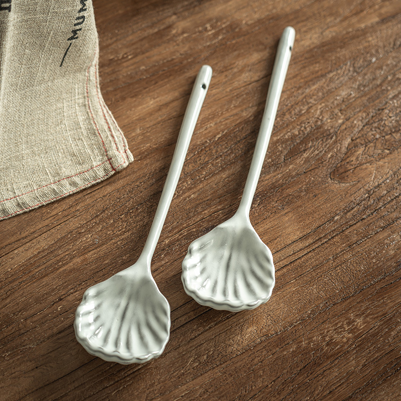 独特少有款长柄扇贝勺浮雕陶瓷勺子家用餐具调羹饭店创意餐勺