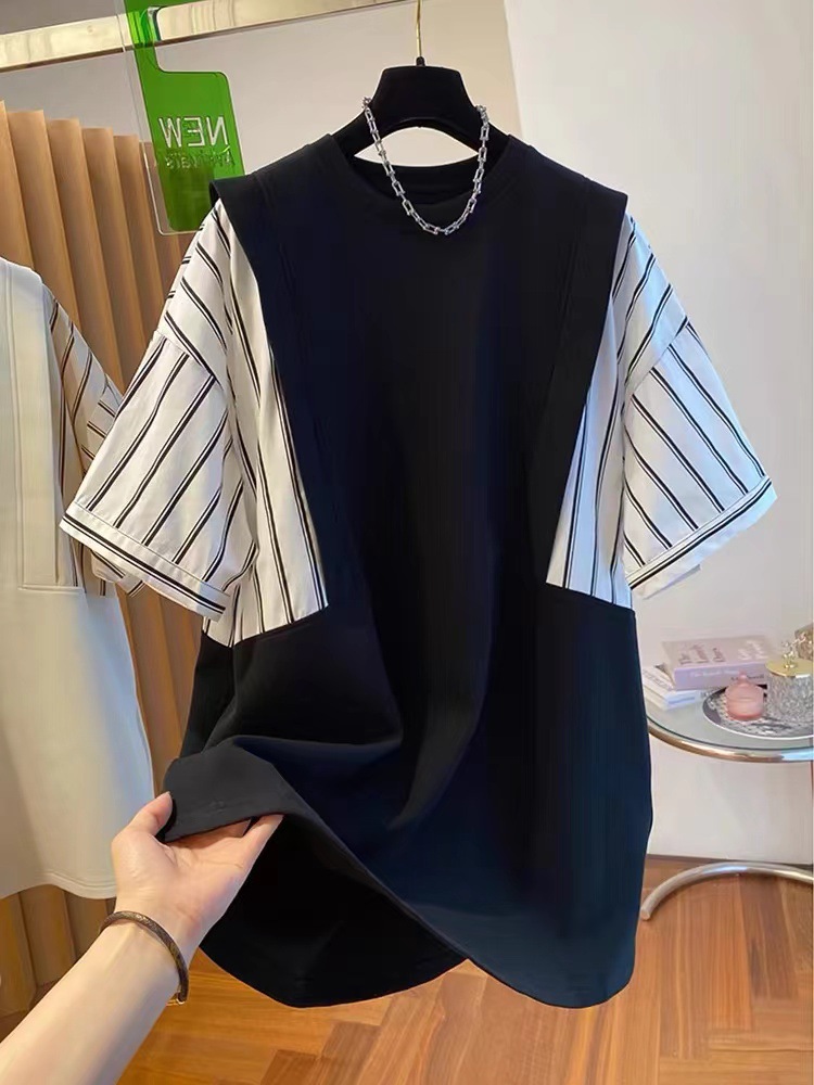 新款假两件衬衫拼接t恤连衣裙女夏季宽松大版胖MM上衣
