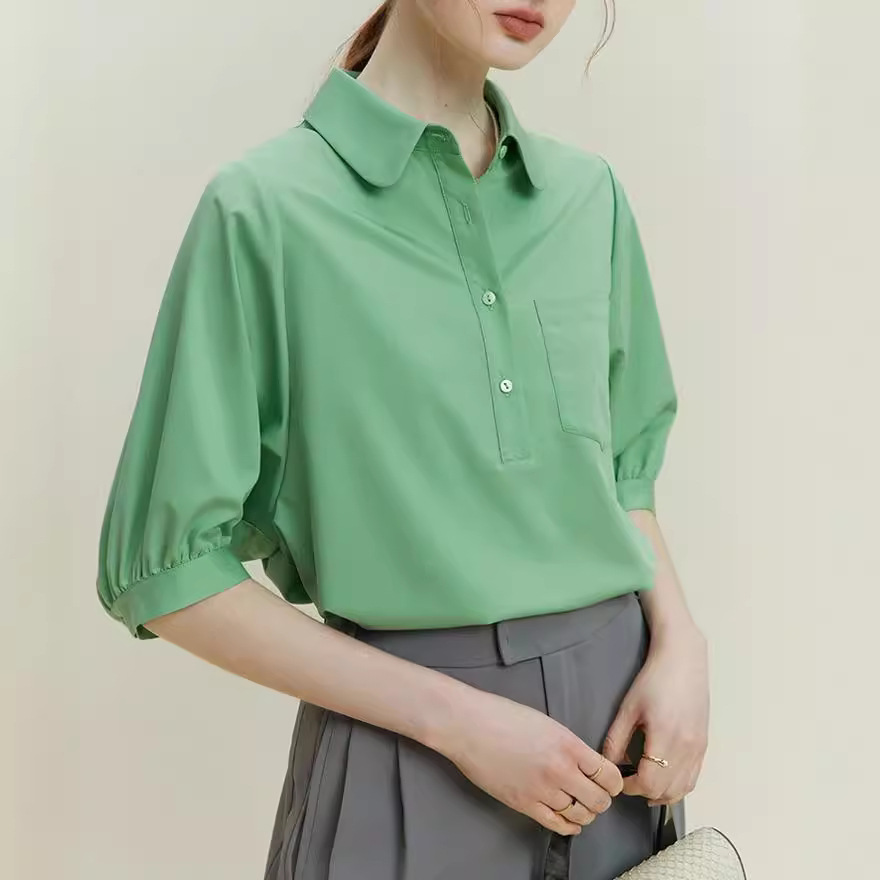 法式气质五分袖上衣女夏款polo领半袖通勤衬衫