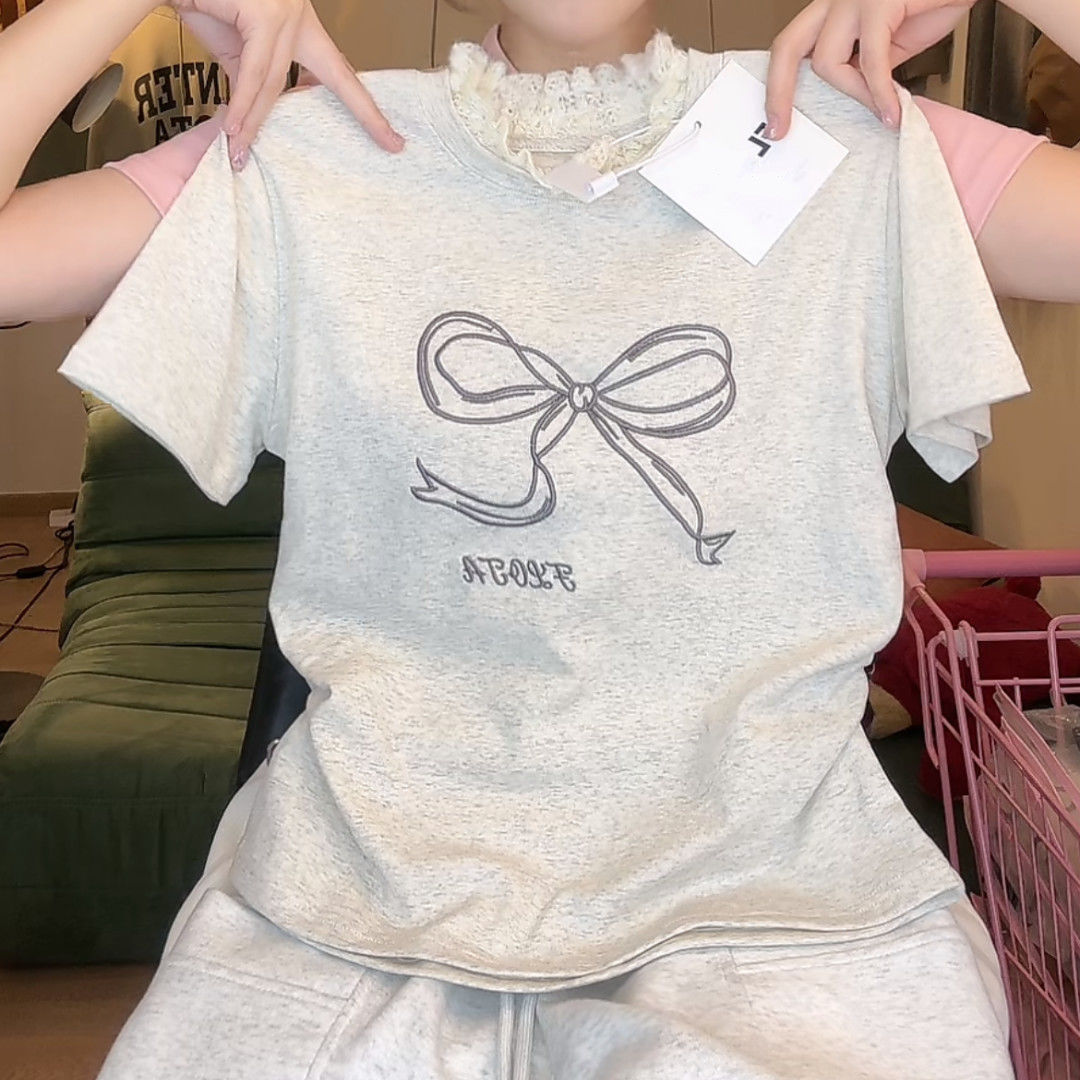 花灰色刺绣蝴蝶结拼接蕾丝短袖T恤新款显瘦修身百搭小个子上衣女