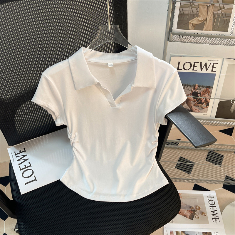 正肩短袖T恤女夏季修身褶皱显瘦短款polo衫翻领V领不规则体桖上衣