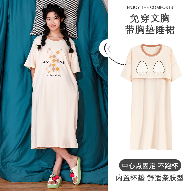 夏薄款睡裙女莫代尔带胸垫短袖可外穿简约中长款睡衣加大码家居服