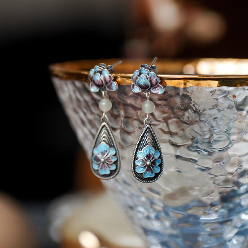 牡丹花烧蓝花丝耳钉镀白金色饰品民族风珐琅彩复古耳环女耳坠礼物