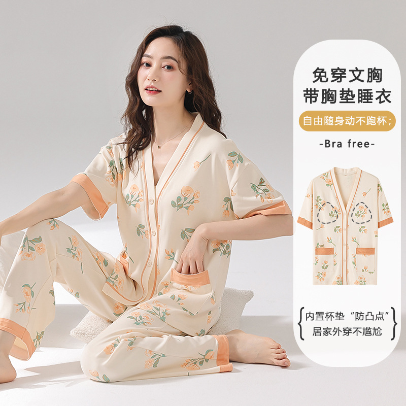 带胸垫一体睡衣女夏季纯棉薄款短袖防凸点外穿大码全棉家居服套装