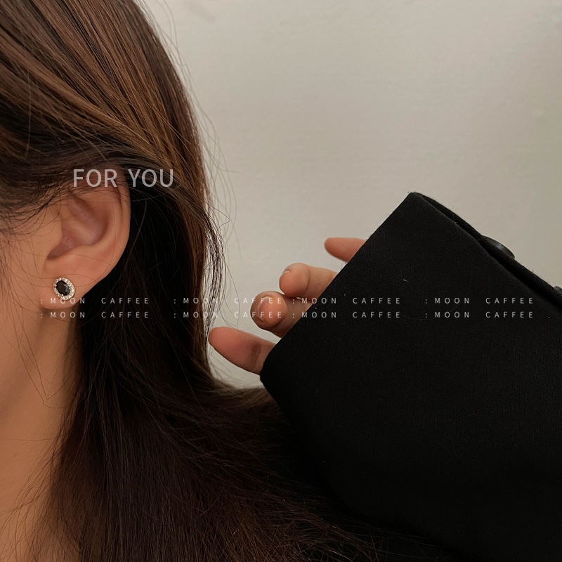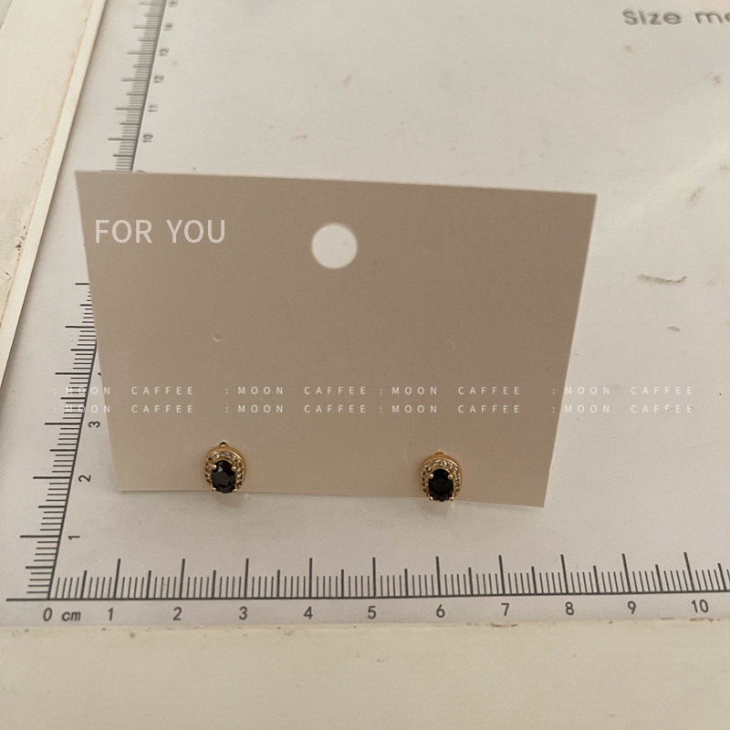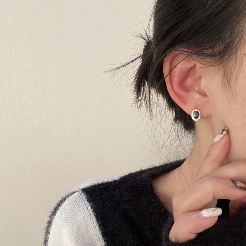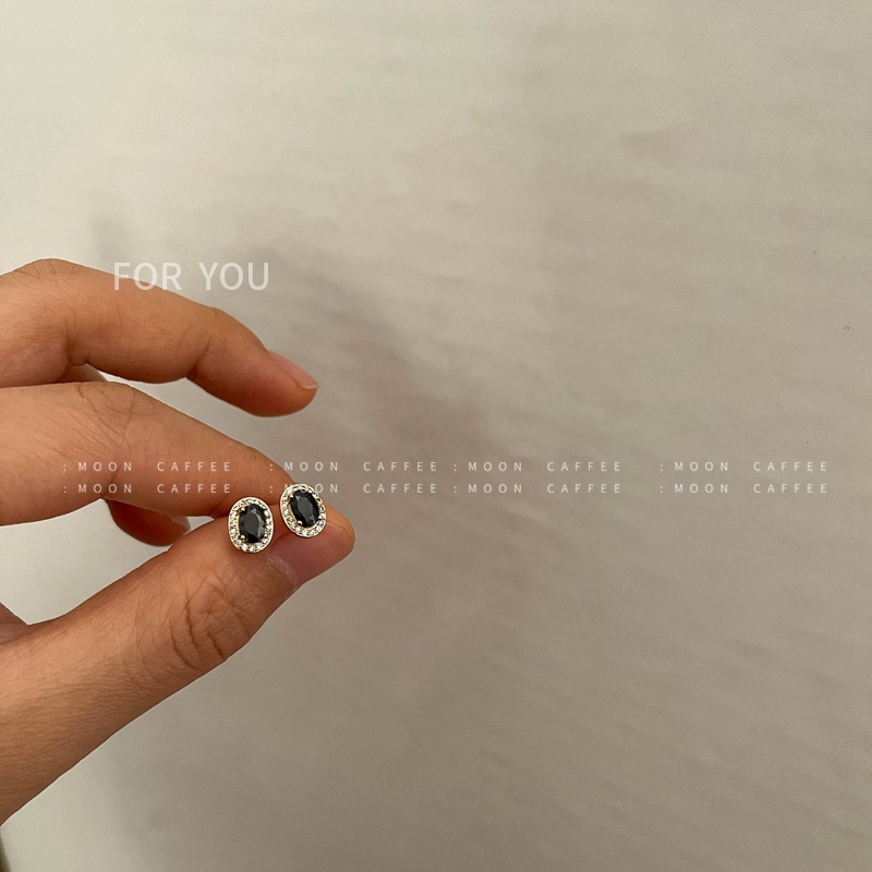 925银针法式黑色宝石锆石镶嵌椭圆几何小耳钉女个性简约百搭耳环
