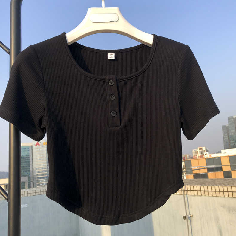 短袖t恤女短款修身夏季新款纯色三粒扣正肩方领百搭显瘦上衣