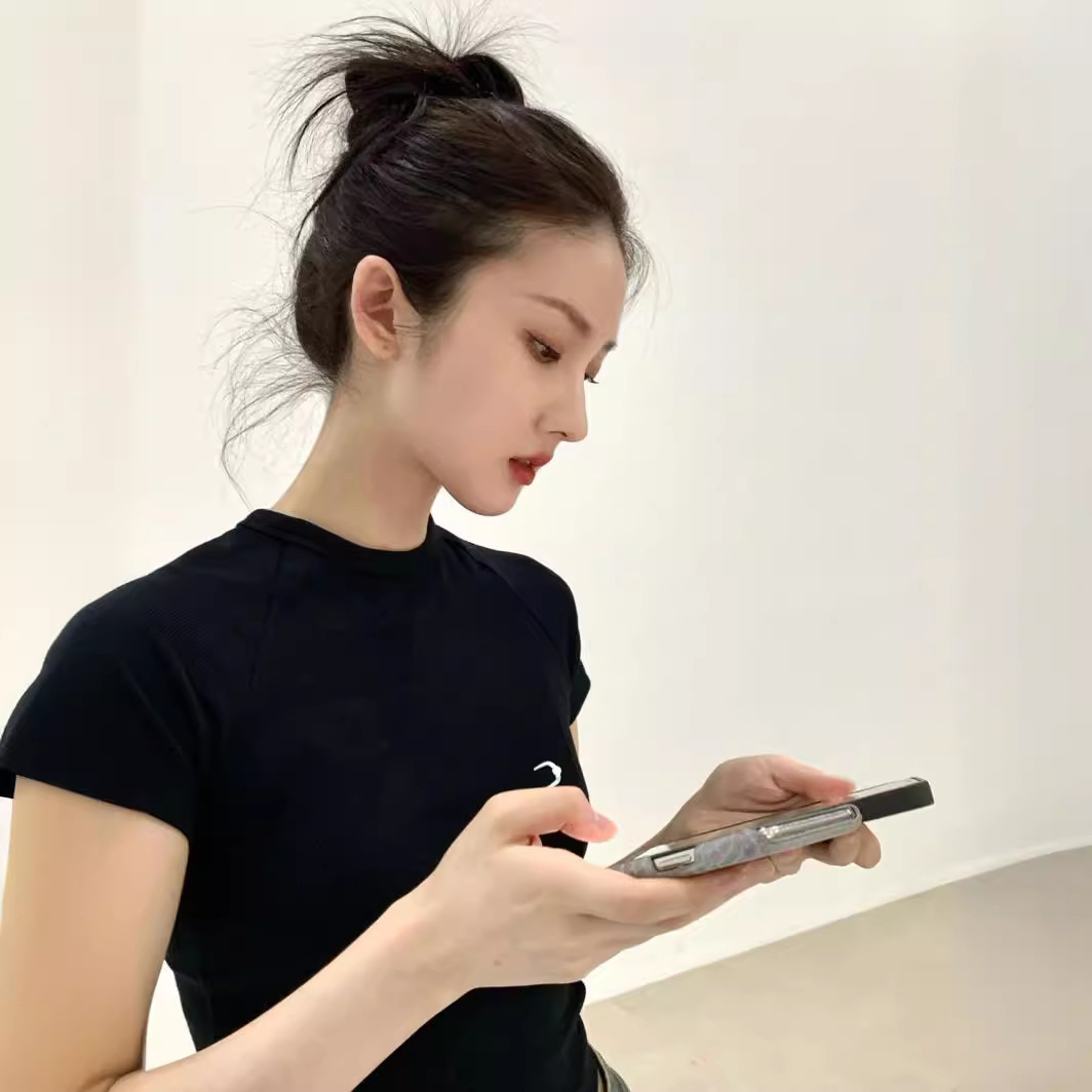 纯欲辣妹半高领刺绣上衣女夏季短袖紧身露脐美式正肩黑色短款上衣