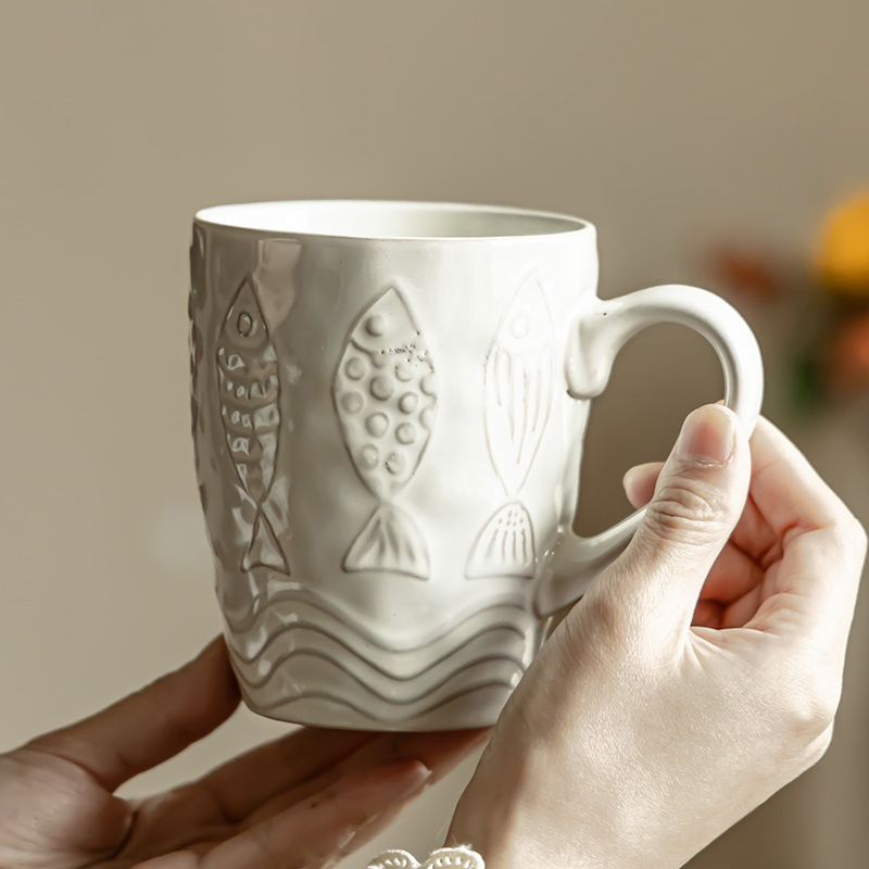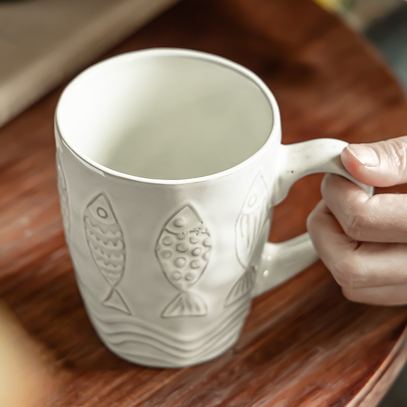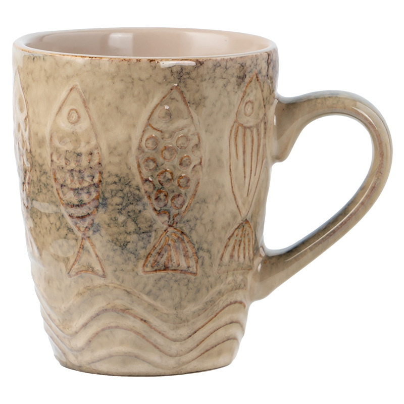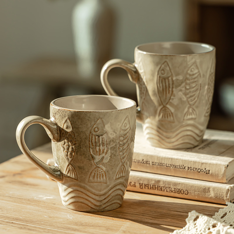 复古水杯做旧款浮雕小鱼杯家用陶瓷杯批发马克杯大容量咖啡杯茶杯