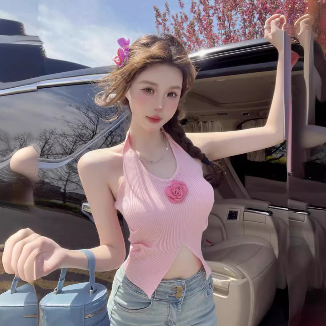 纯欲玫瑰花朵挂脖小吊带夏季抽褶百搭收腰性感露脐短款抹胸背心女