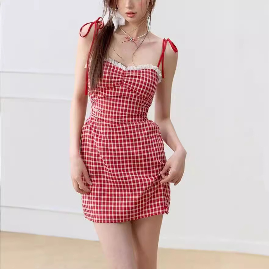 红色格纹吊带连衣裙女新款夏季甜美收腰系带裙子
