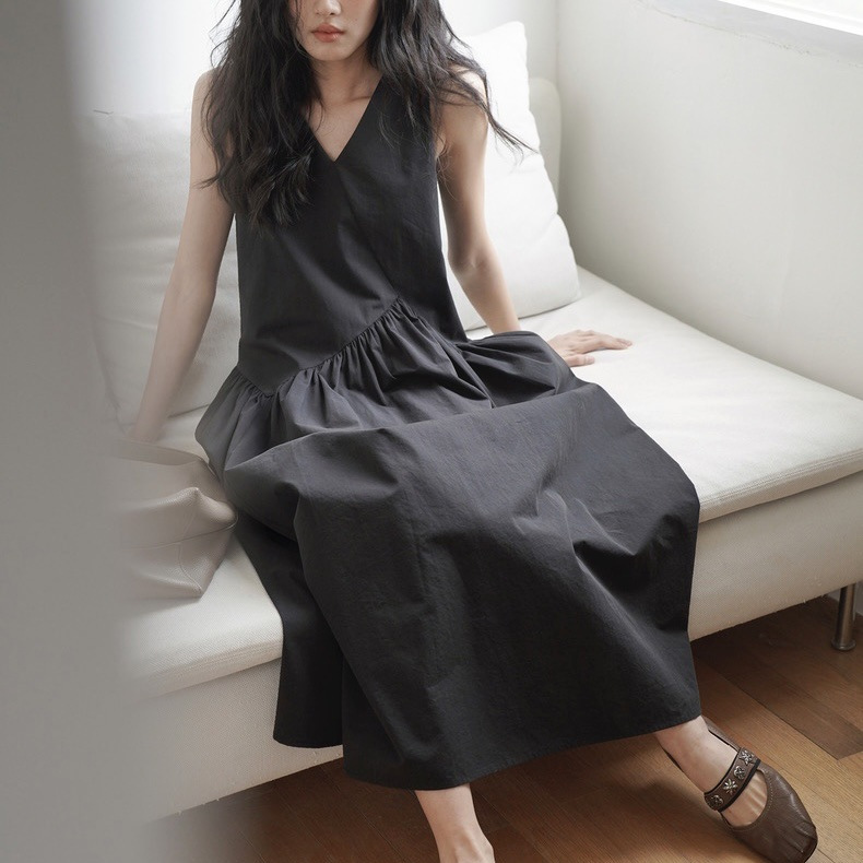 法式气质v领背心连衣裙女夏季新款黑色高腰无袖裙子