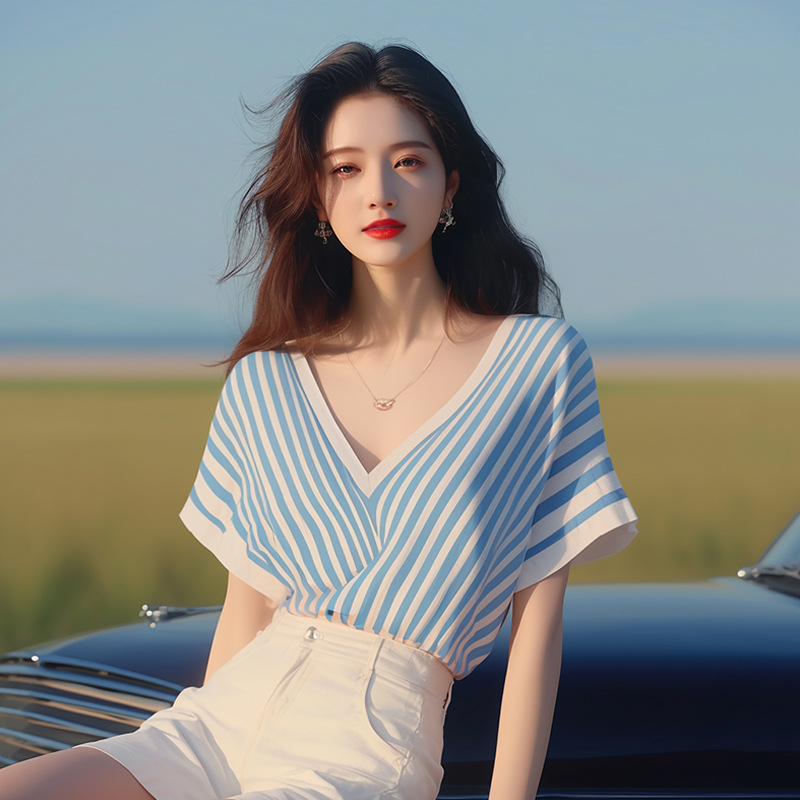 韩系chic洋气独特别致漂亮上衣宽松百搭显瘦蓝色条纹V领T恤女夏