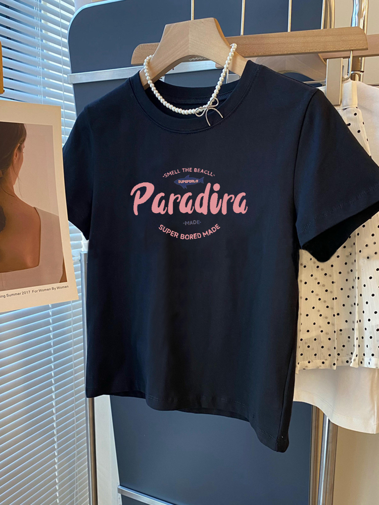 2025夏季新款藏蓝色全棉短袖t恤女宽松百搭字母印花减龄小众上衣