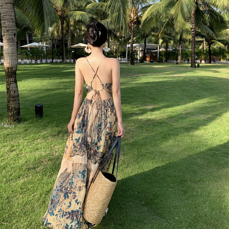夏季欧式复古吊带连衣裙女V领小众后背镂空显瘦度假仙女裙春