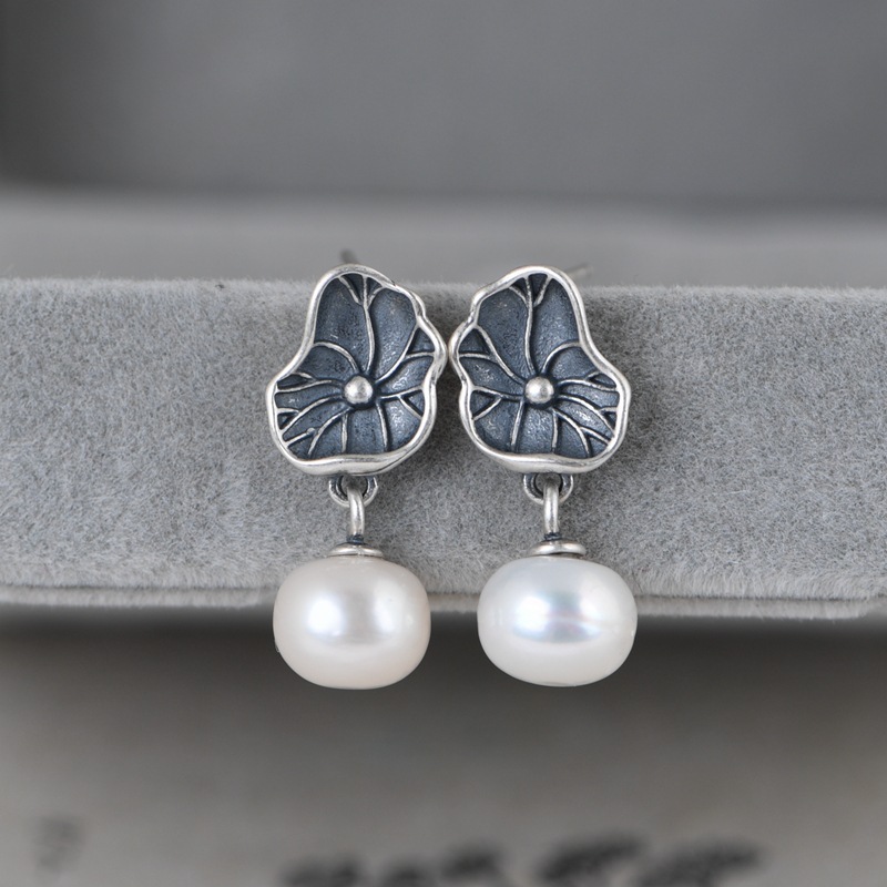 S925银复古时尚荷叶淡水珍珠耳饰批发女文艺气质银耳钉耳坠