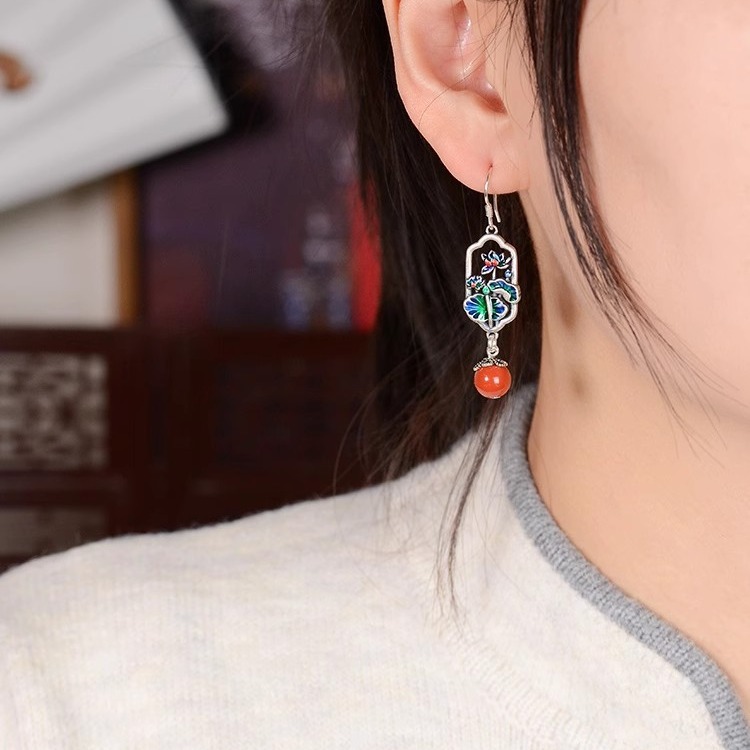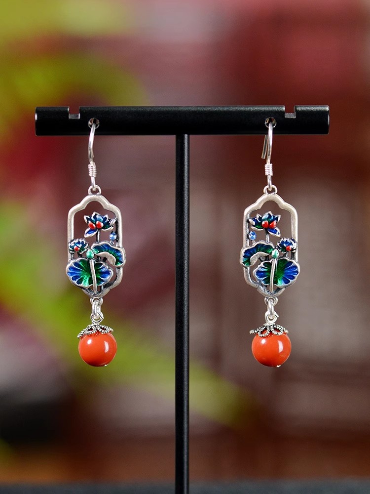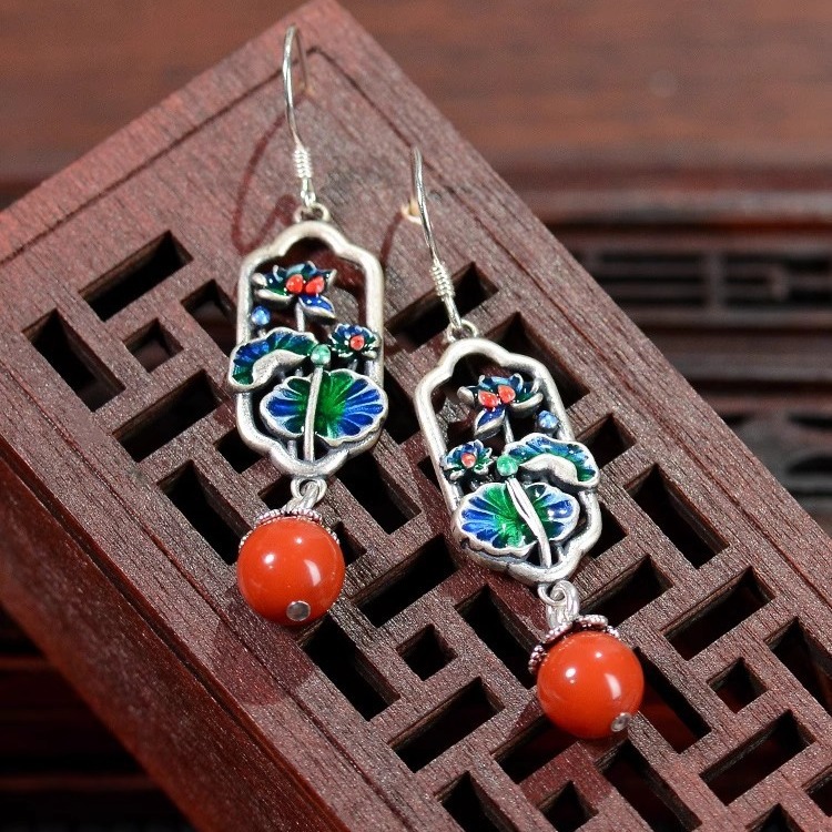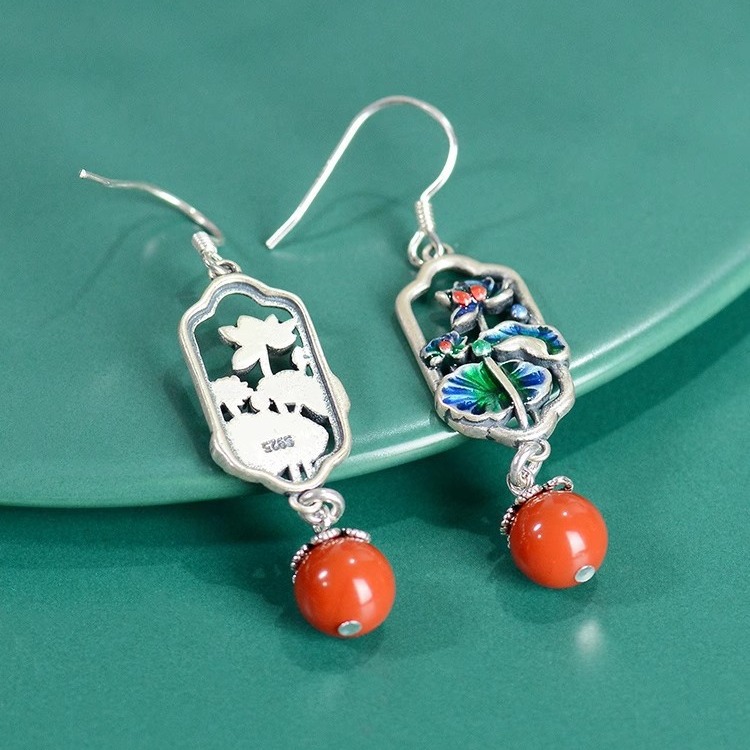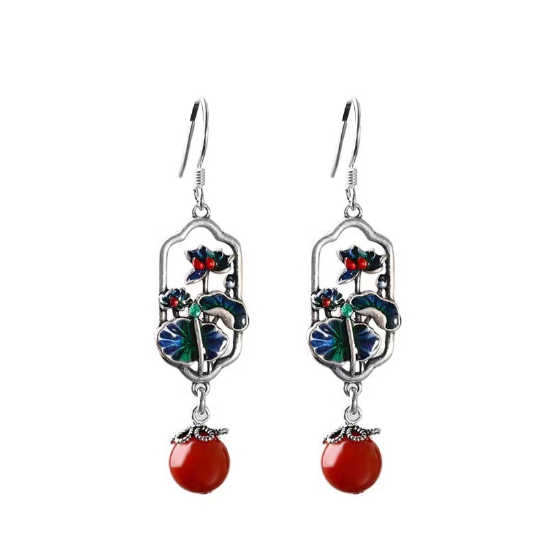 天然耳环女s925纯银复古珐琅民族风耳饰精致荷叶荷花耳坠