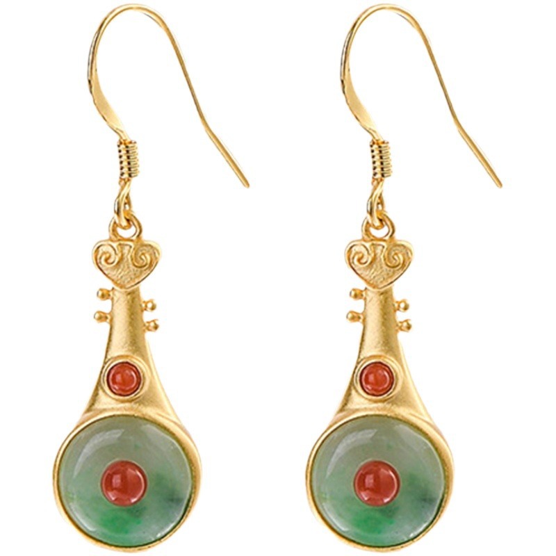 925银镀金复古民族风琵琶耳环女翡翠A货耳坠古典宫廷玉石耳饰配饰
