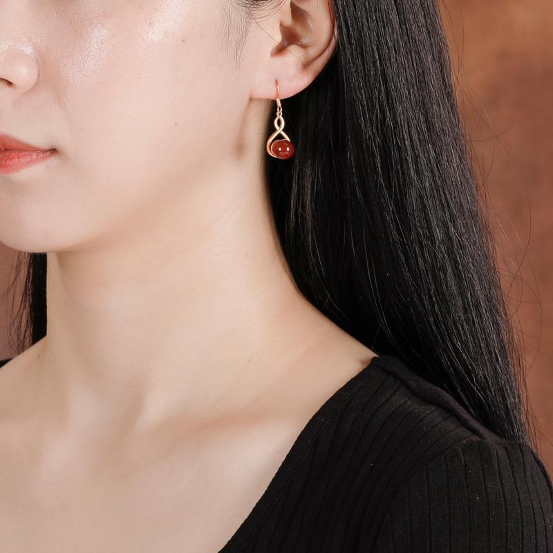 新款古法金S925纯银红玛 瑙水滴耳环宫廷心形耳坠镶嵌彩宝玉髓耳