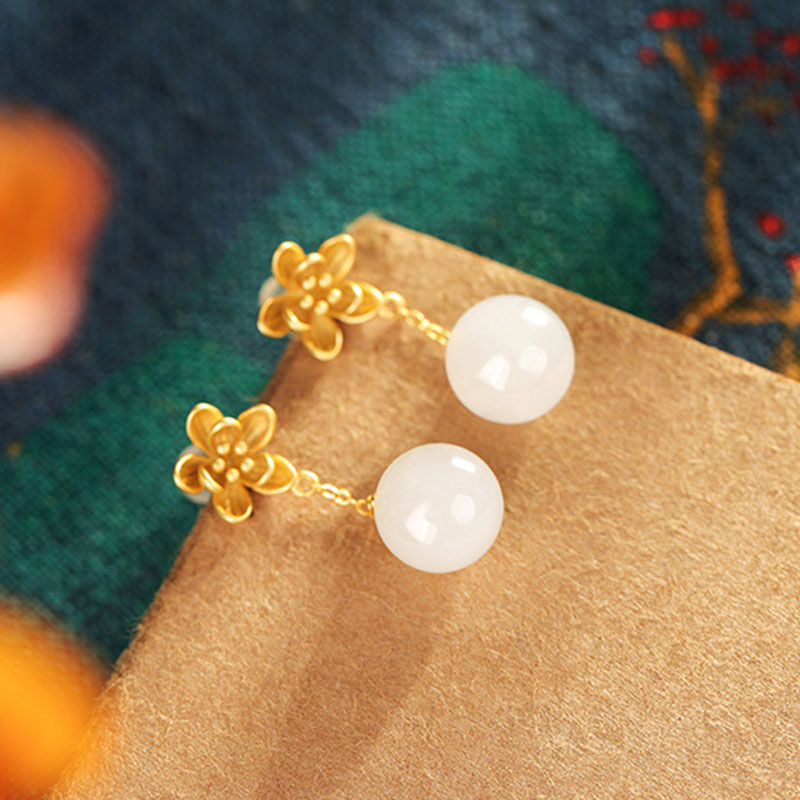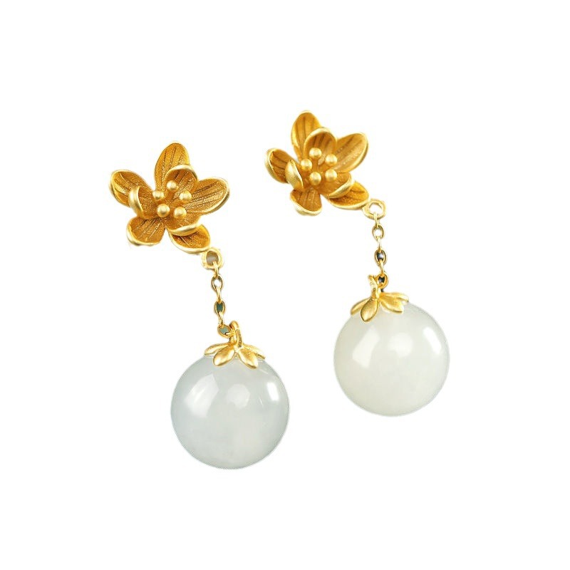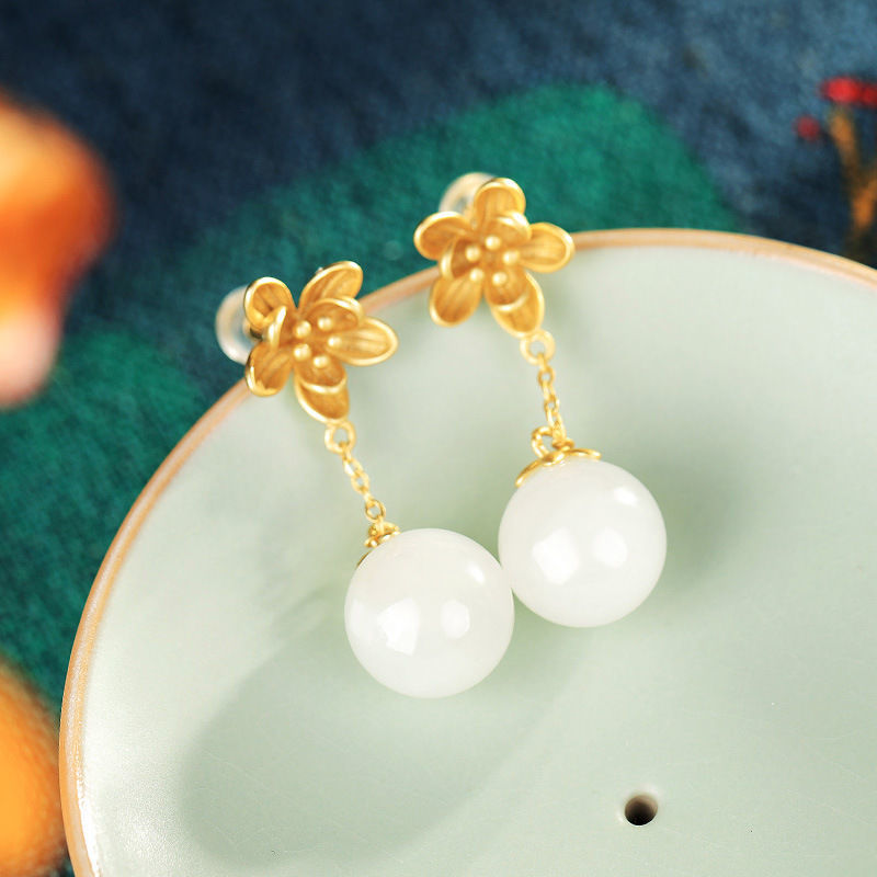 古法金925花朵耳钉长款简约气质百搭天然和田白玉耳饰耳坠饰品