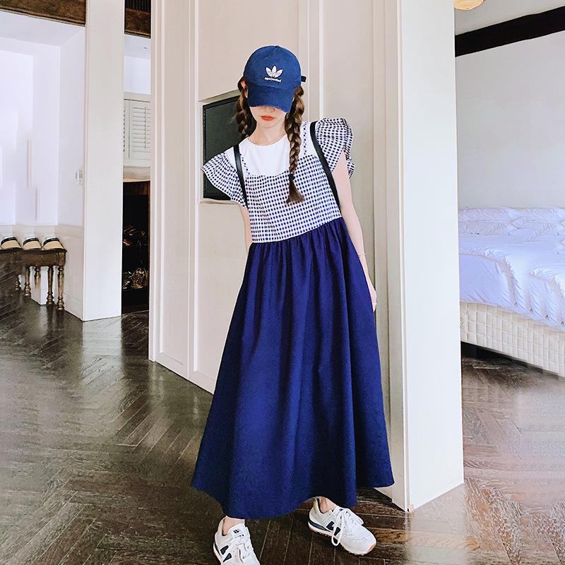 实拍文艺减龄圆领飞飞袖撞色格纹拼接假两件高腰显瘦大裙摆连衣裙