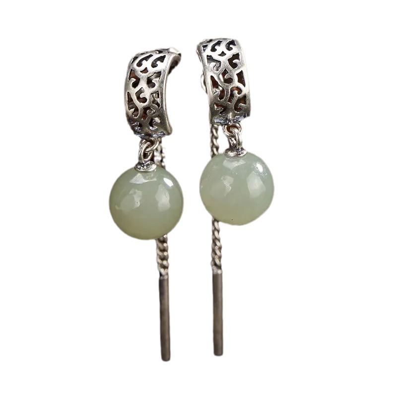 S925泰银圆珠和田白玉髓做旧古风民族风宫廷风国潮复古女耳钉耳线