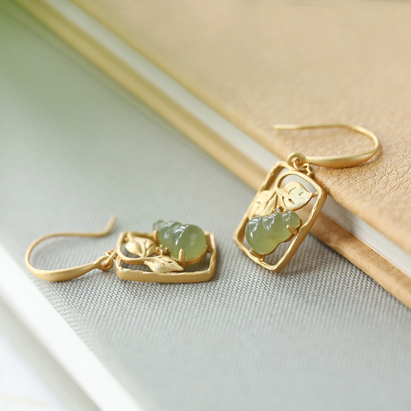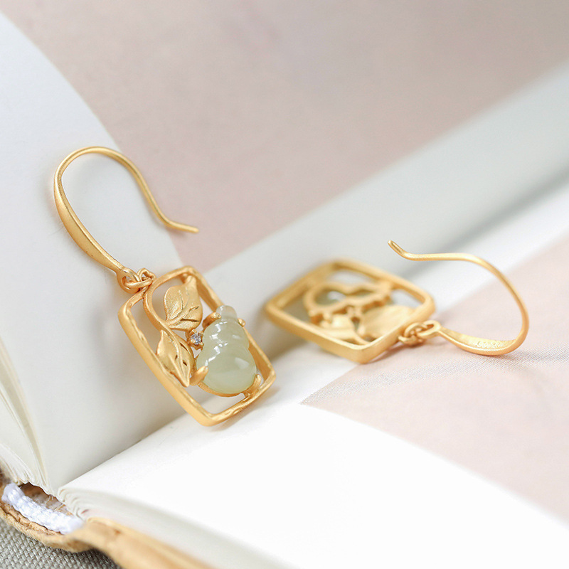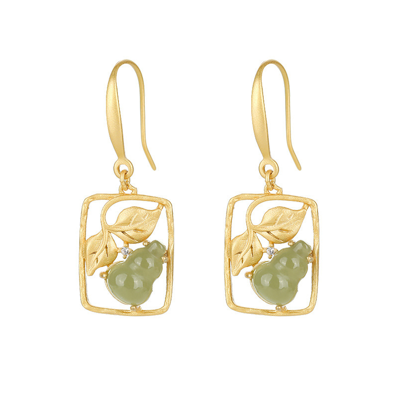 S925纯银镀金镶嵌和田青福禄葫芦精雕叶子复古小众轻奢设计耳环