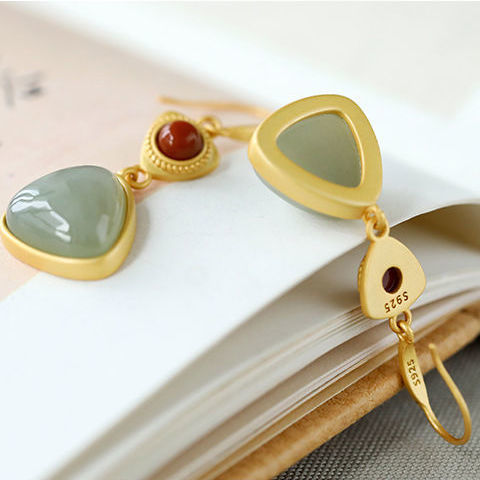 宫廷风设计古法金耳钩女新款潮三角形和田青玉纯银耳饰品