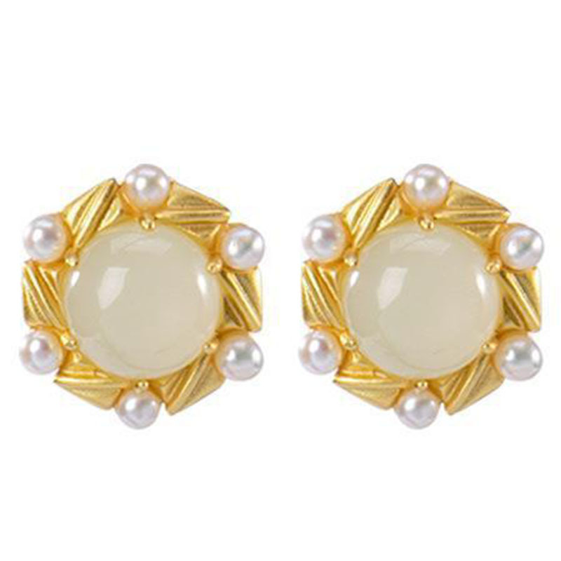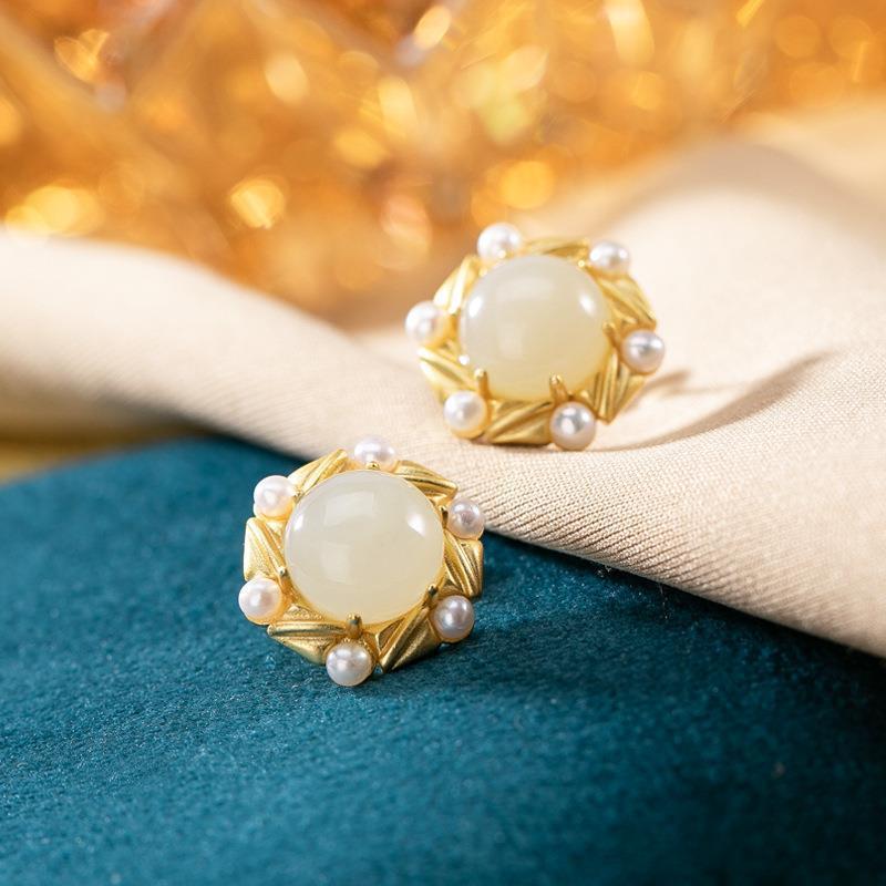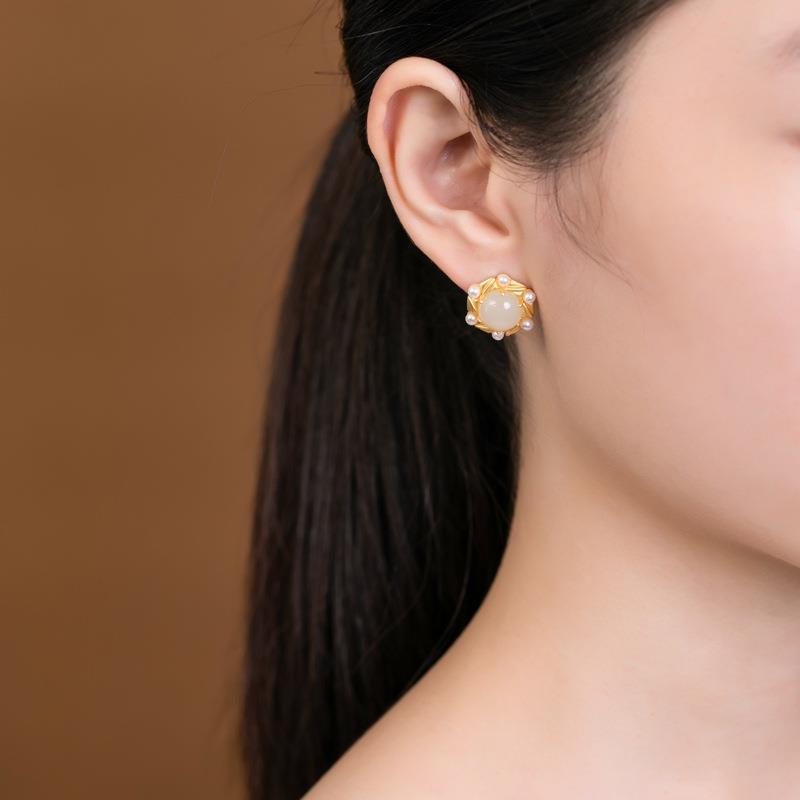 六轮纷飞镶嵌和田白玉耳钉复古宫廷风贝水珍珠镀金925纯银耳钉