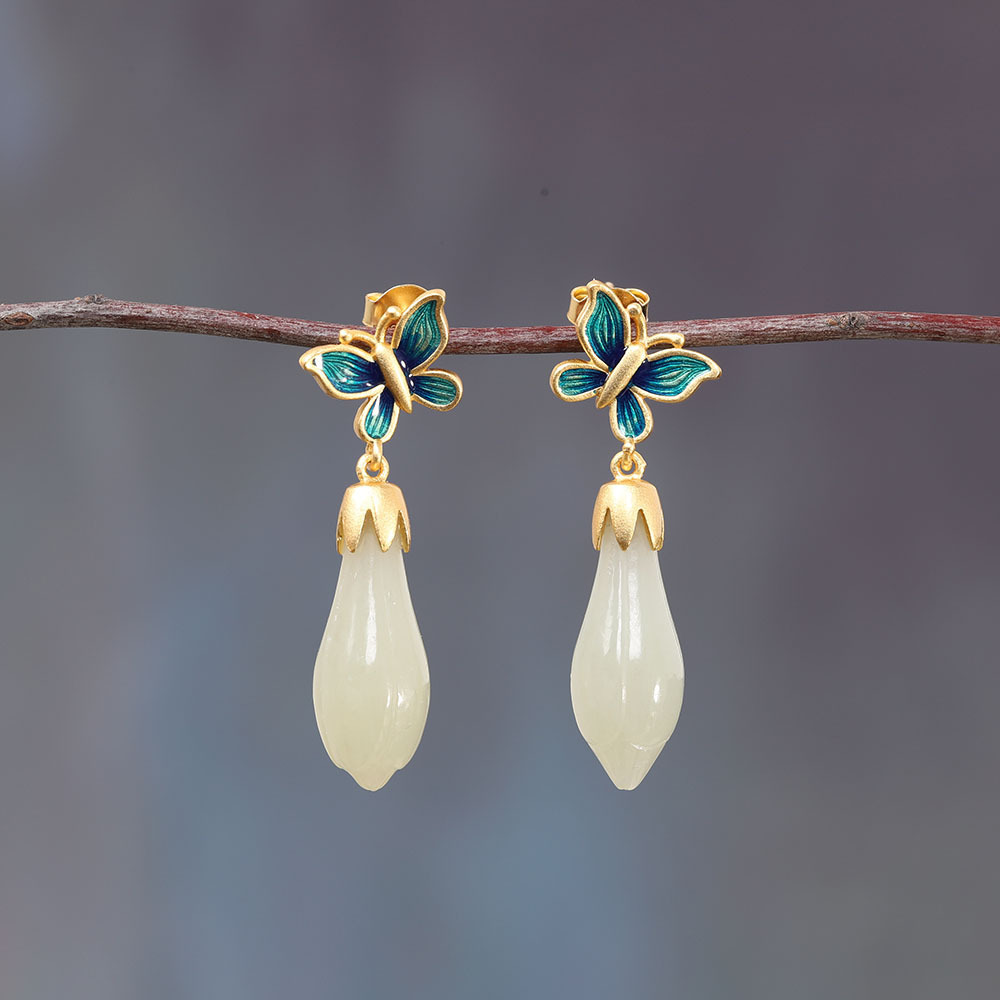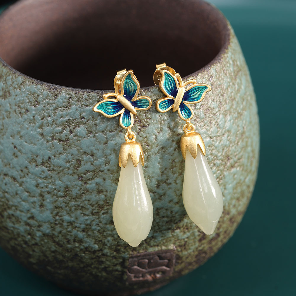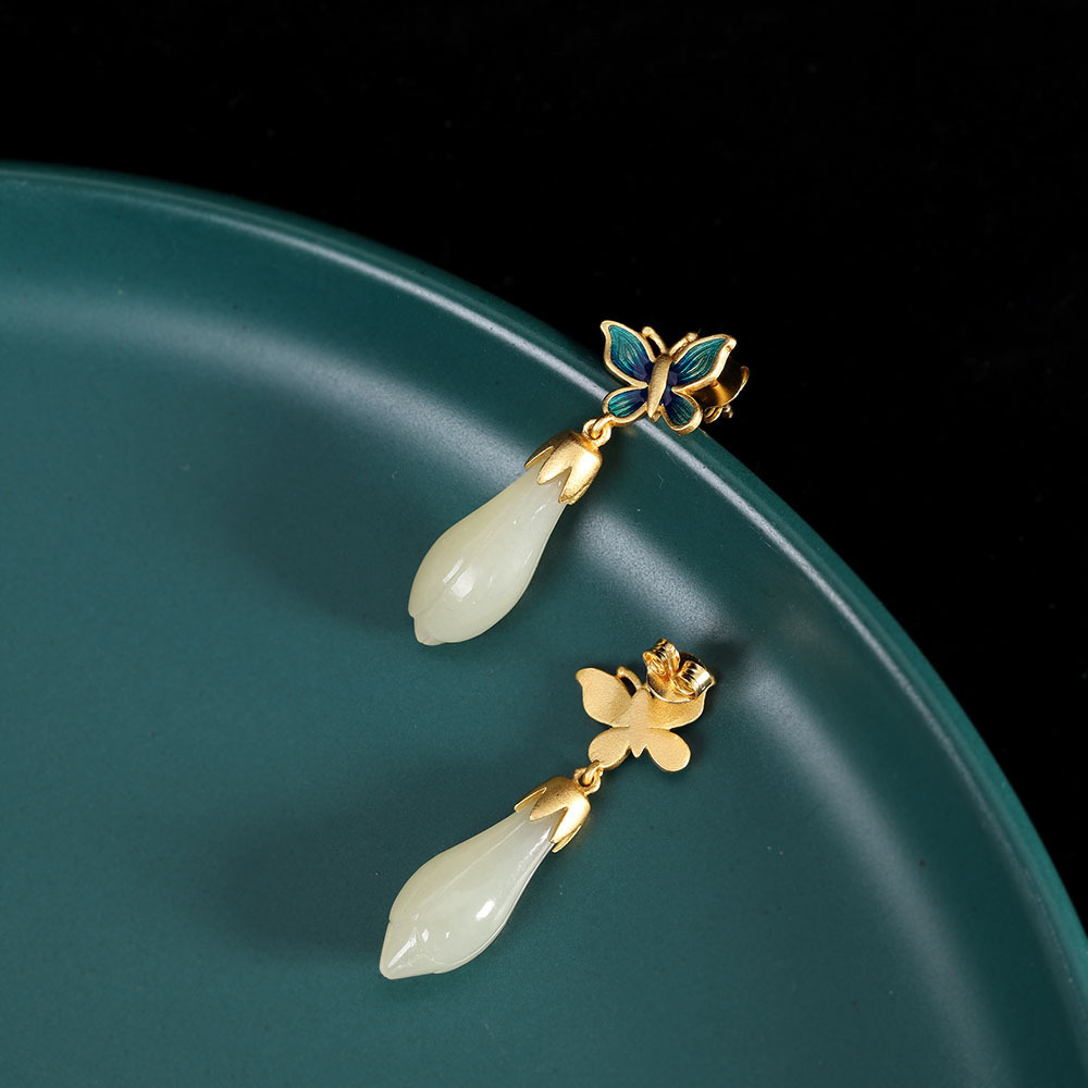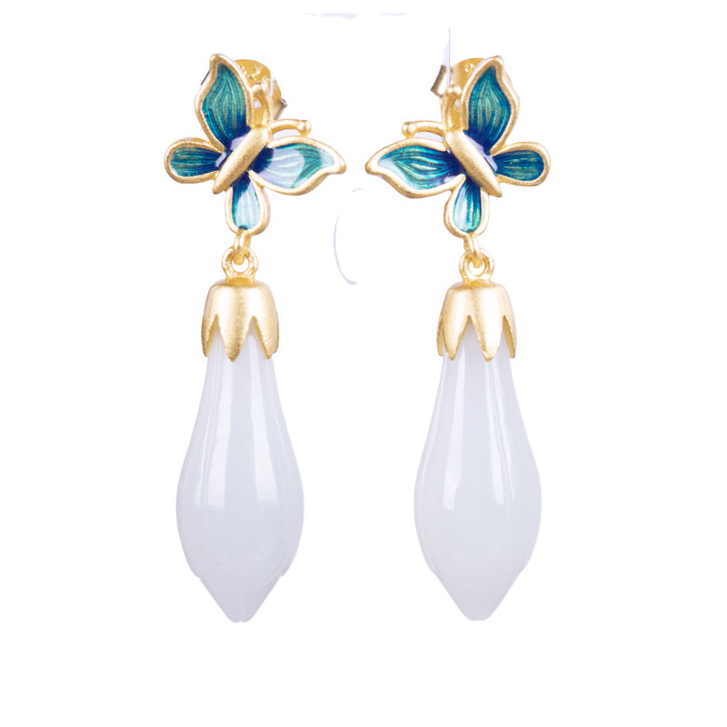 潮流时尚东方古典宫廷风镶嵌和田白玉耳环轻奢设计镀金色彩小蝴蝶