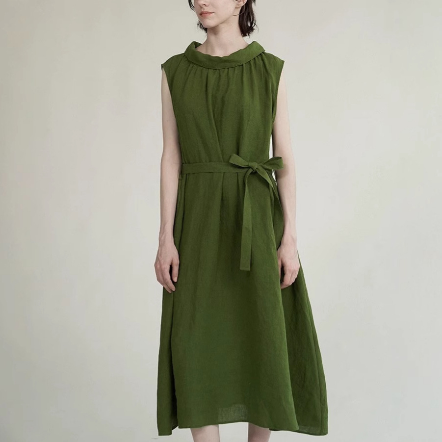 两面穿领口抽褶腰带无袖连衣裙中长裙女