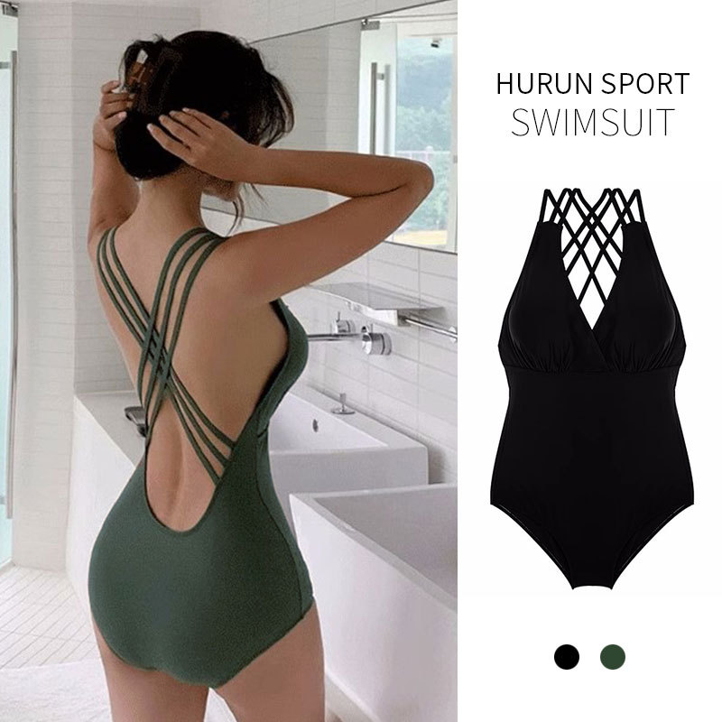 韩国新款时尚纯色连体性感肩带交叉深v美背遮肚显瘦温泉女游泳衣